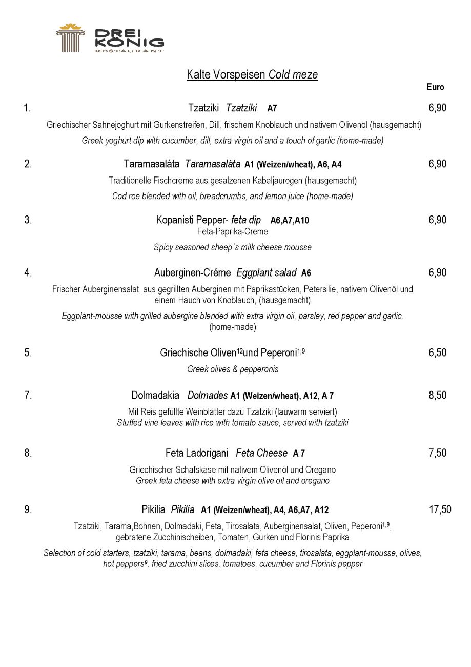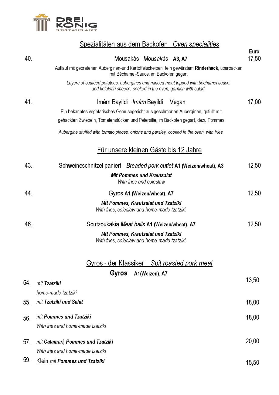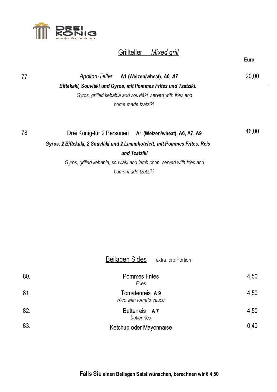 Entdecken Sie mit uns die Vorzüge unverfälschter griechischer Kochkunst! Als Vorspeise empfehlen wir Ihnen Tsatsiki, Auberginen-Creme, griechische Oliven und Pfefferoni oder eines unserer warmen Gerichte. Selbstverständlich stehen auch ein Brotkorb und diverse Salat-Variationen für Sie bereit. Als Hauptspeise servieren wir Klassiker wie Moussaká, Souvlaki, Gyros und Bifteki mit Pommes frites, Tomaten- oder Butterreis. Besonders ans Herz legen möchten wir Ihnen unsere beiden Grillteller „Apollon“ und „Drei-König-Teller“ mit ihrem bunten Zutaten-Mix. Außerdem haben wir verschiedene Pita-Variationen auf der Karte. Gerne informieren wir Sie auf Wunsch über alle Inhaltsstoffe in unseren Speisen.