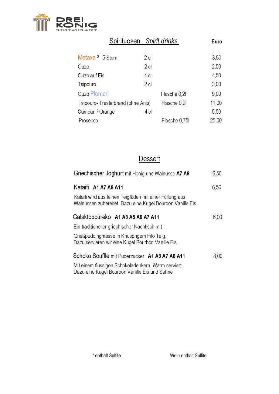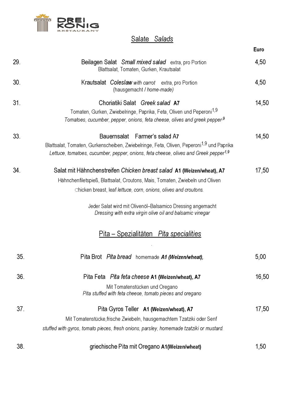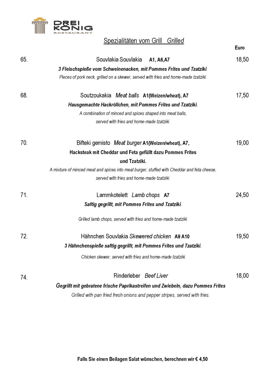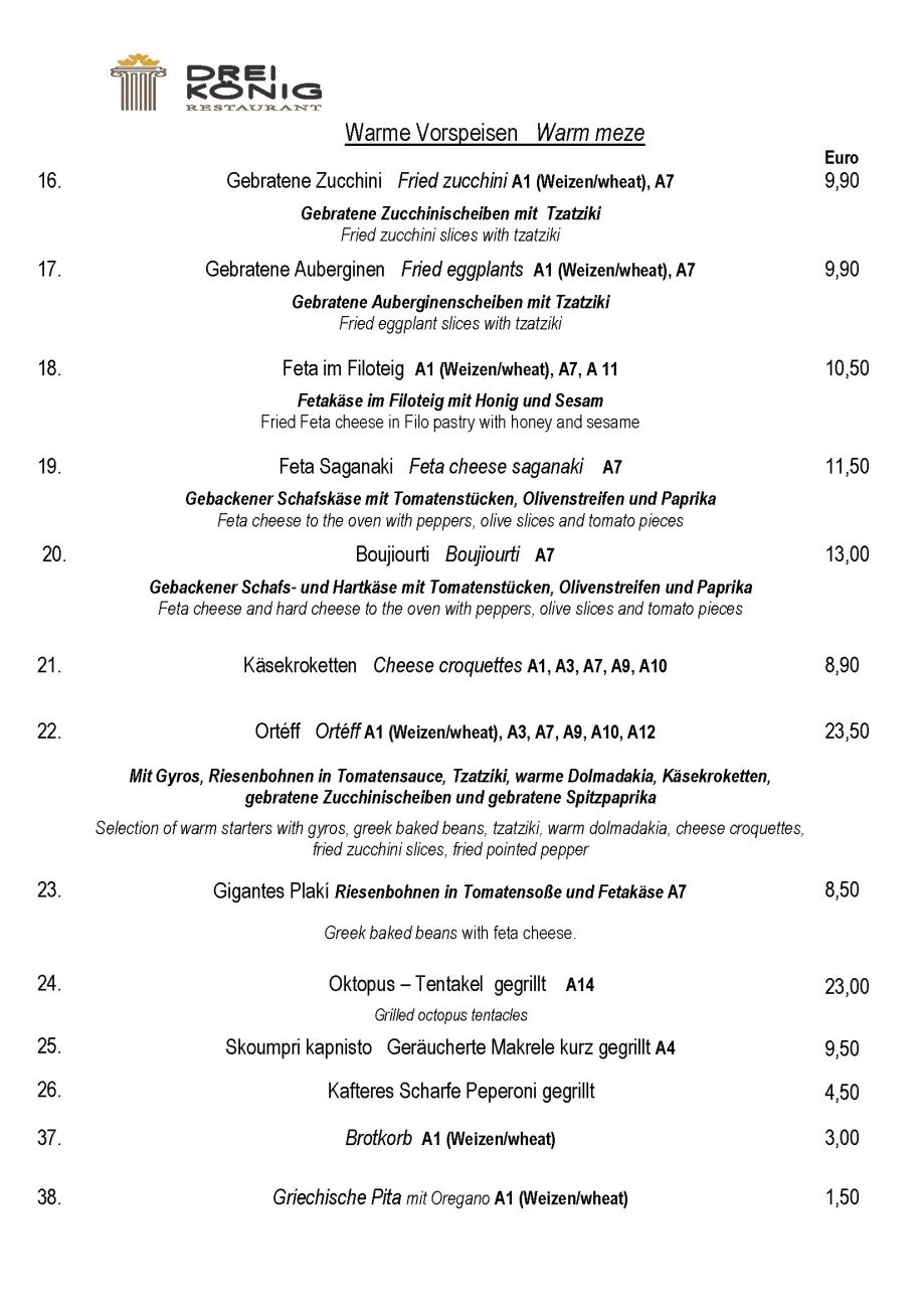 Entdecken Sie mit uns die Vorzüge unverfälschter griechischer Kochkunst! Als Vorspeise empfehlen wir Ihnen Tsatsiki, Auberginen-Creme, griechische Oliven und Pfefferoni oder eines unserer warmen Gerichte. Selbstverständlich stehen auch ein Brotkorb und diverse Salat-Variationen für Sie bereit. Als Hauptspeise servieren wir Klassiker wie Moussaká, Souvlaki, Gyros und Bifteki mit Pommes frites, Tomaten- oder Butterreis. Besonders ans Herz legen möchten wir Ihnen unsere beiden Grillteller „Apollon“ und „Drei-König-Teller“ mit ihrem bunten Zutaten-Mix. Außerdem haben wir verschiedene Pita-Variationen auf der Karte. Gerne informieren wir Sie auf Wunsch über alle Inhaltsstoffe in unseren Speisen.
